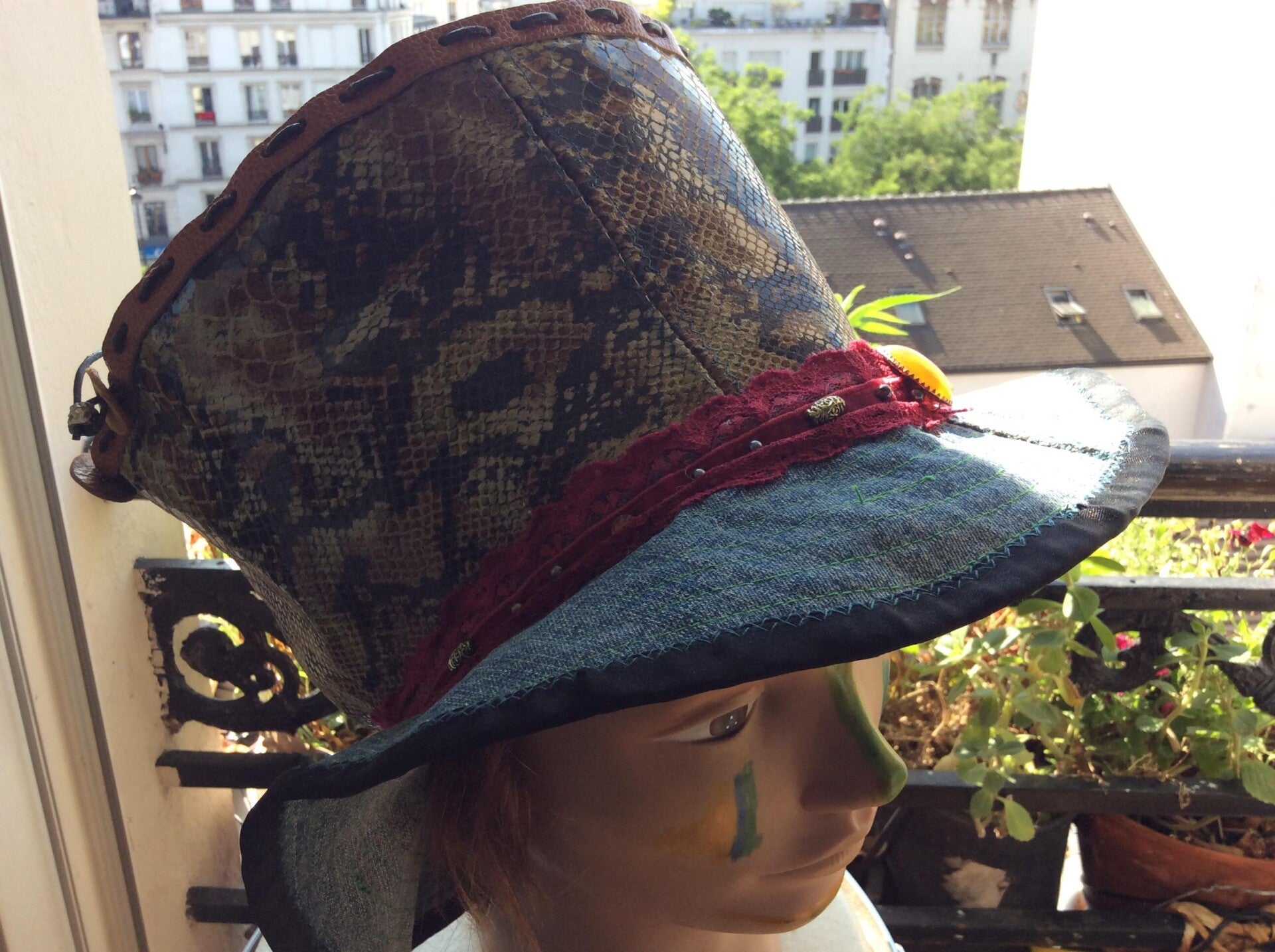 vous l'attendiez ce chapeau n'est-ce pas ? Si si ! Vous qui lisez ces lignes. Voici un chapeau pour ceux ou celles qui ont une âme d'artiste. Haut de forme. Un magnifique ruban de dentelle rose pour le côté glamour. Imitation cuir façon reptile. Jean, faux cuir et breloques en déco.