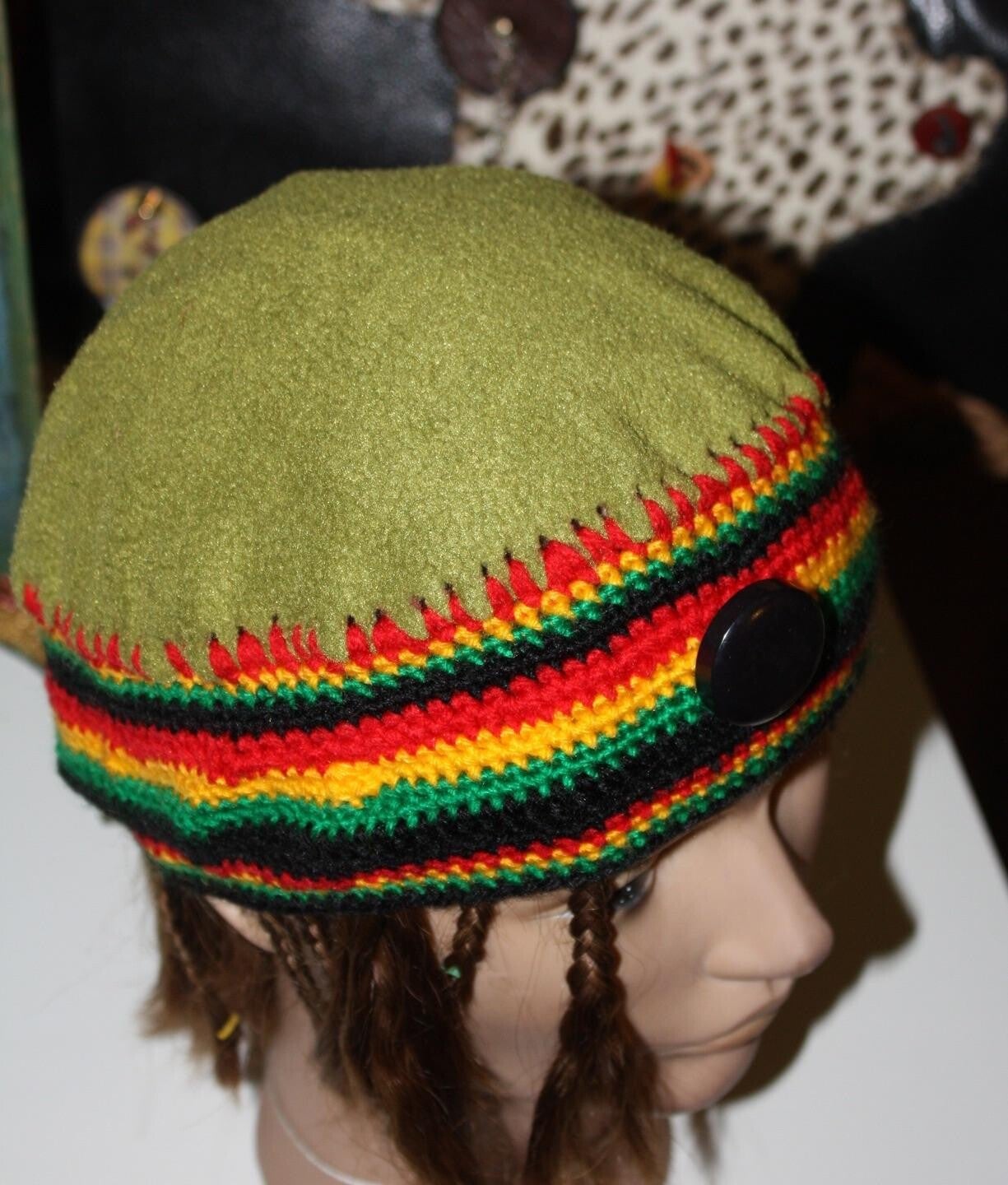 Voici un couvre chef tranquille qui n'attend plus que vous. Idéal au printemps' en automne et hiver. Modèle unique. Un bien joli bouton en ornementation. Bonnet style "Rasta" . Couleur Jamaïque et Reggae. Tout est là pour la Good vibration dans le one love Reggae . Yeah Man !.