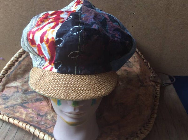 casquette gavroche fait de patchwork de tissus imprimé et jean délavé.